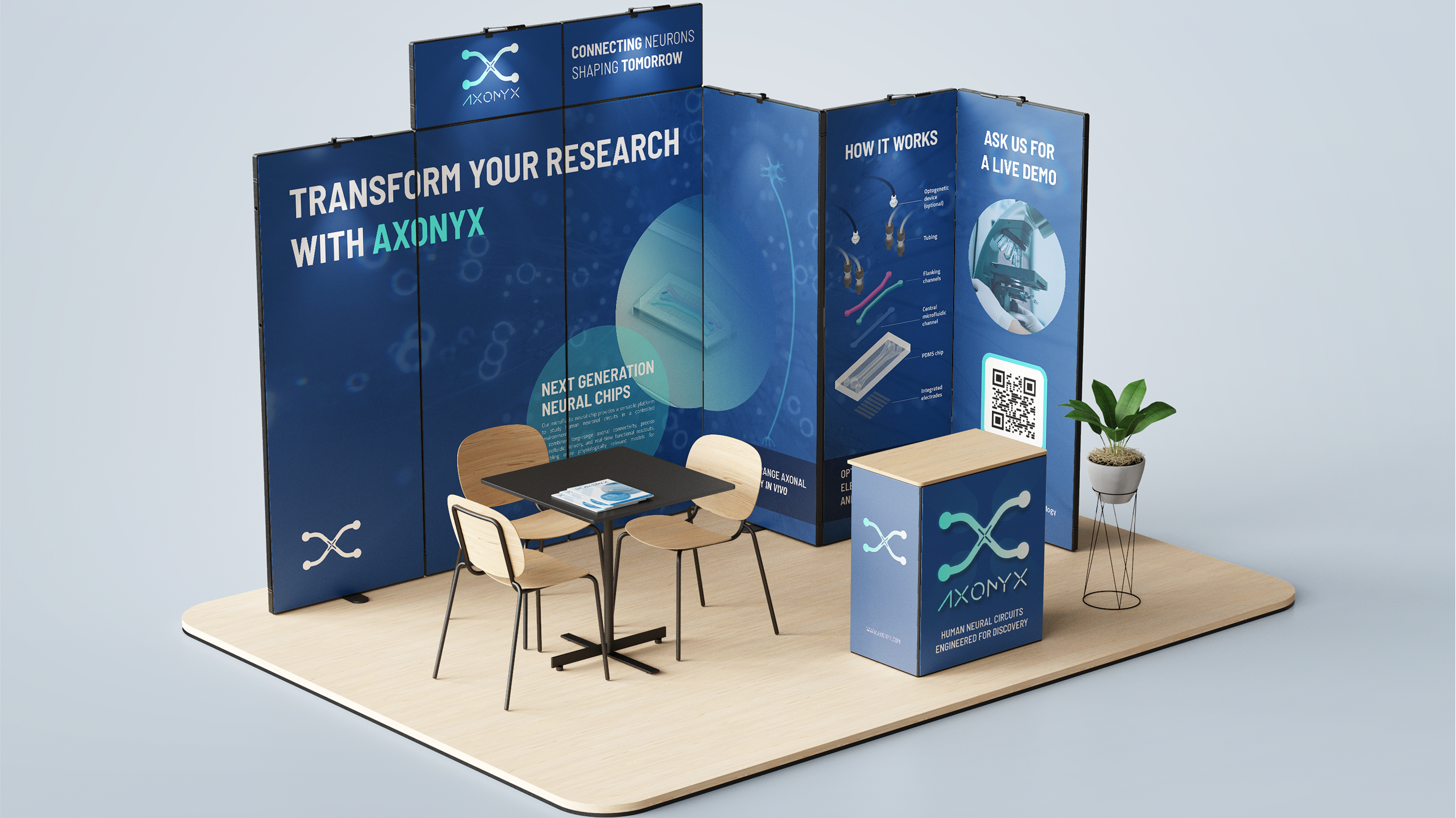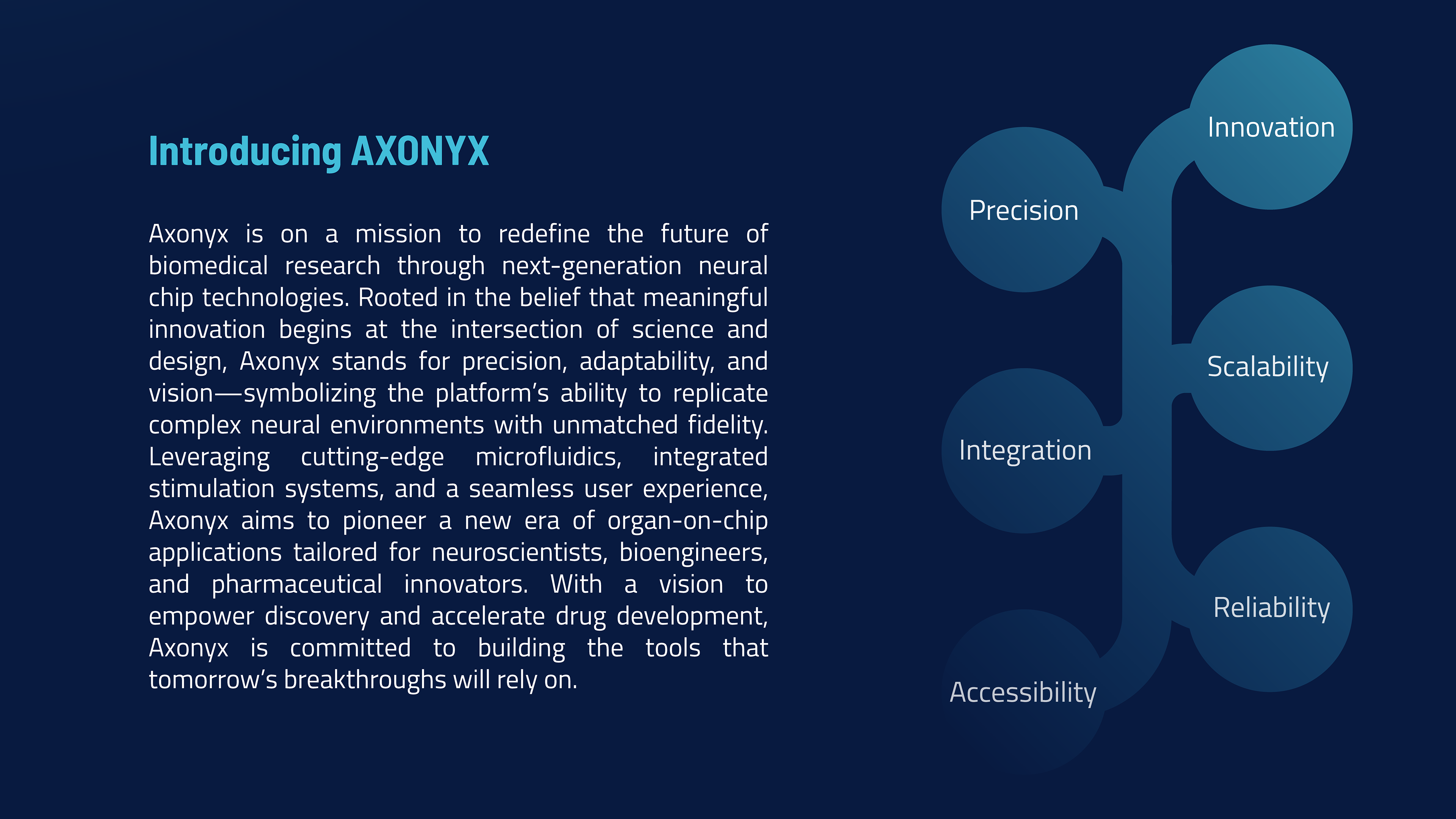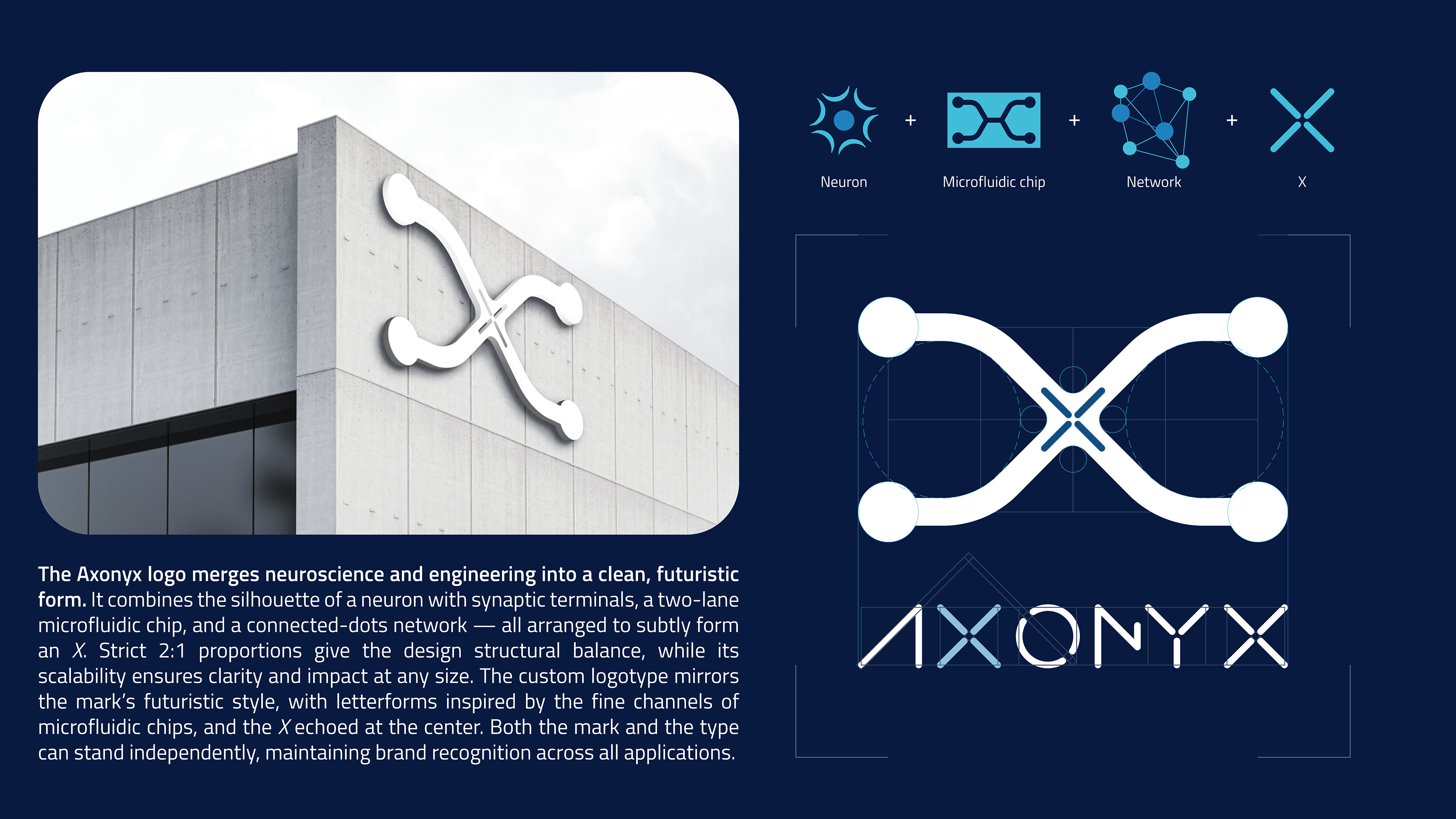 AXONYX is a fictional biotech brand I developed to explore how design can convey complex scientific innovation. The project includes logo, visual identity, and brand system for a neural organ-on-chip concept.